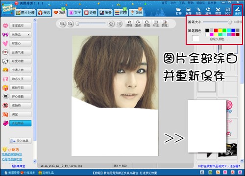 2. 使用右上方的“涂鸦”画笔,把图片全部涂白。别觉的奇怪,这只是为了最后的效果做铺垫。完成之后要记得另外保存起来,可别覆盖了原图,浪费一张靓照就可惜了。