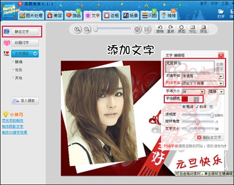 想要给朋友们写些什么样的祝词就完全随便你自己了,这里就先写上大众化的“元旦快乐”,再选择字体和字体的大小颜色等属性调整即可。