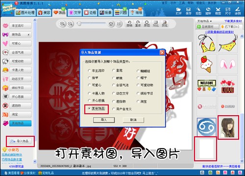 小提示:如果大家手上有自己喜欢的或相宜的素材,都可以导入到“饰品”菜单下的用户自定义中选用。
