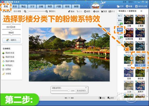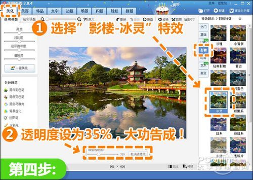 4.最后选择“影楼-冰灵”特效,透明度设为35%,整个风景照的美化就完成啦!