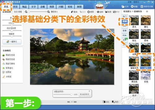1.在软件中打开原图后,选择“基础-全彩”特效,还原风景照的好天气。