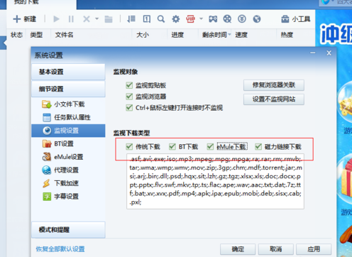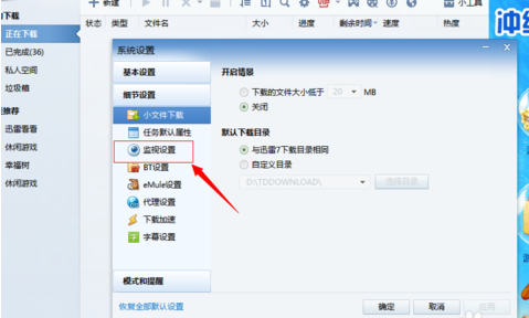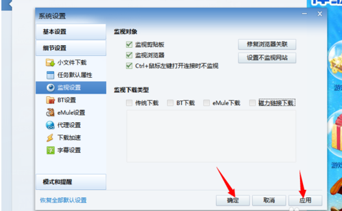 2、打开细节设置页面,进步一锁定监视设置,没错自动下载都是这里惹的祸,监视设置选项里有四个选项,分别是传统下载,BT下载,eMule下载,磁力链接下载,将前面的勾统统去掉。至于四个选项的意思自己百度长知识。