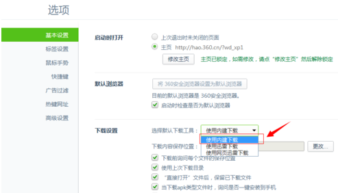 3、选择默认下载工具,下面有三个选项,分别是使用内建下载,使用迅雷下载和使用网页迅雷下载,勾选使用内建下载,选择后直接退出即可。