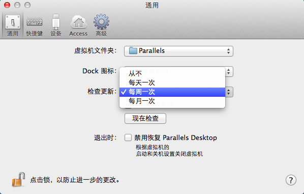 要调整 Parallels 检查软件更新的频率,可从检查更新菜单中选择从不、每天一次、每周一次或每月一次。