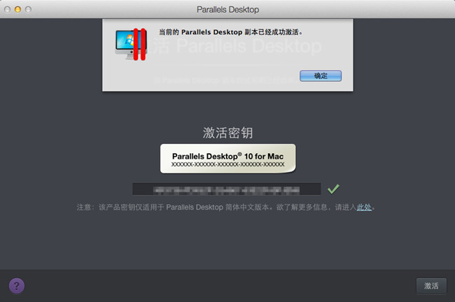 在安装Parallels Desktop过程中,会提示激活Parallels Desktop,如果你已经购买Parallels Desktop,只要输入激活密钥,Parallels Desktop会自动检测激活密钥的正确性,点击“激活”。