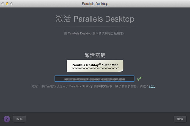 在激活Parallels Desktop窗口,如果你已经购买Parallels Desktop,输入激活密钥,Parallels Desktop会自动检测激活密钥的正确性,然后点击“激活”。