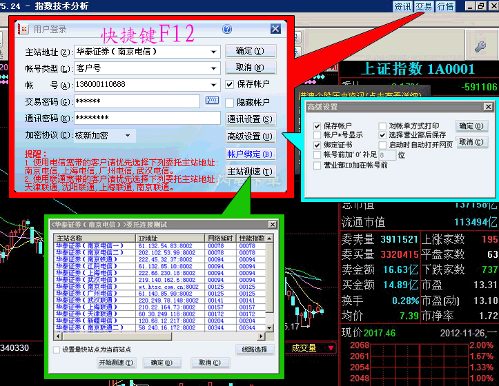 安装软件,按F12调出交易系统 ,通过主站测速选择最快的交易服务器