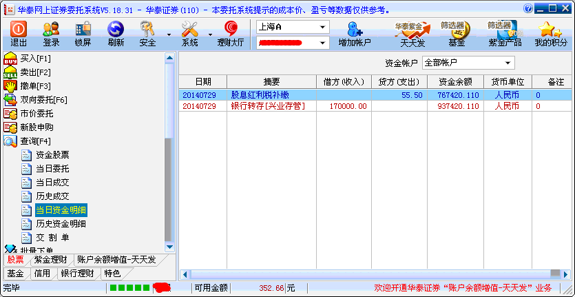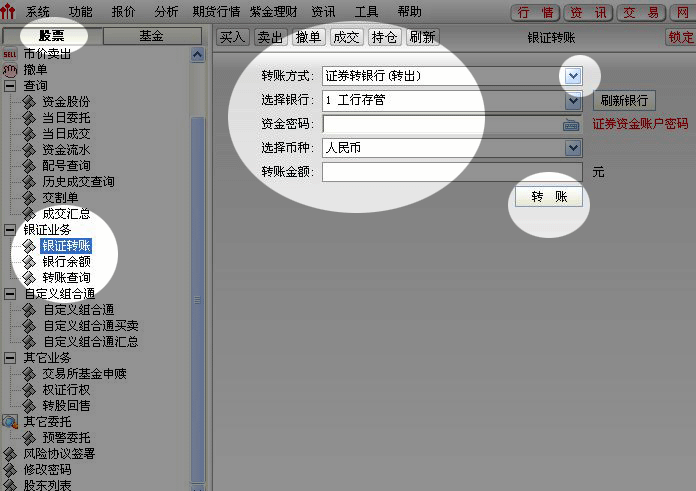 *卖出股票后可以使用资金密码转账到银行卡。初次和交易密码相同