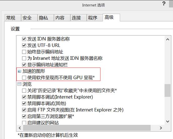 b.Win8系统下解决方法:打开IE10-Internet选项 – 高级菜单页 – 加速的图形选项–勾上“使用软件呈现而不使用GPU呈现”,然后确定