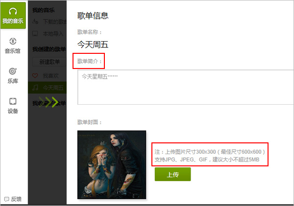 2、进入编辑歌单信息页面,完善“歌单简介”,上传与歌单意义相近的“歌单封面”,为该歌单打上对应“标签”,“保存”即是发表了该歌单。