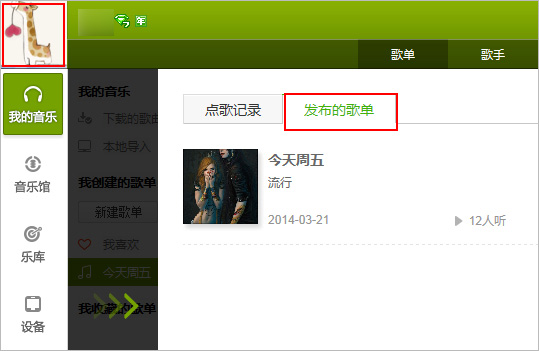 3、发表后,点击播放器左上角您的头像,即可查看已发表的歌单(不支持在此删除歌单)。