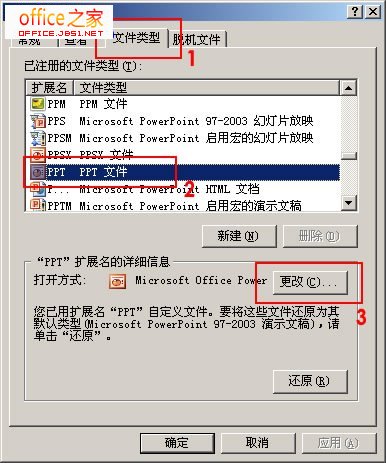 2、在弹出的“文件夹选项”对话框中选择“文件类型”,然后在下面找到“PPT 文件”,最后单击更改;