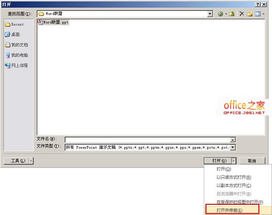 2、然后在打开窗口中找到需要修复的PPT文件,选中后单击右下角“打开”旁边的小三角下拉按钮,在弹出的下拉列表中选择“打开并修复”即可。