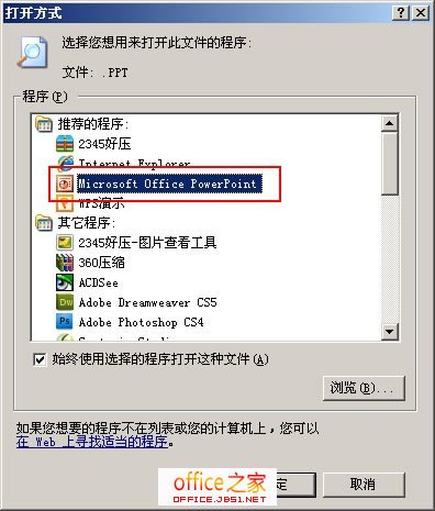 3、在“打开方式”中选择“Microsoft Office PowerPoint”最后单击“确定”即可。