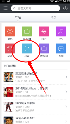 2、打开迅雷后进入默认界面广场,点击小说图标,进入电子书频道。