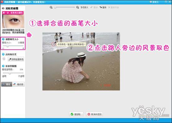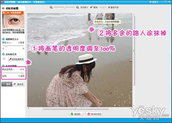 这里巧妙地利用“消除黑眼圈”这个功能,不仅可以帮助爱美的人消除眼袋黑眼圈,还能用相同的原理去除数码照片中的日期和无关路人。只不过在去除路人杂景时,一定要耐心仔细,不断取景来涂抹使消除的效果干净自然!当然再配合一些色调的调节,就会让照片的意境更美了!