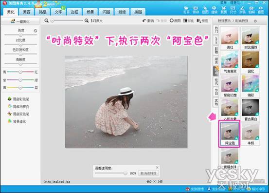 1、到“美化”菜单下,点击“时尚特效”。连续执行两次“阿宝色”特效。
