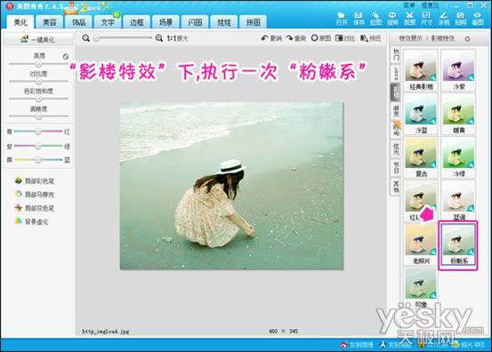 3、最后在“影楼特效”中执行一次“粉嫩系”特效。这样照片就有了淡淡的靛青色调,使照片看上去更有FEEL了!