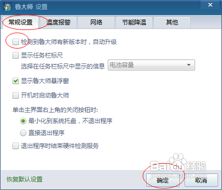 3、在常规设置选项卡中,取消勾选检测到鲁大师有新版本的时候,自动更新的选项,然后点击右下角的设置按钮,如图所示: