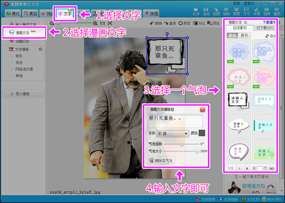 可爱的漫画文字素材,让亲们都可以给照片加上好玩的对白,变成可爱的四格漫画故事,强烈建议大家下载新版美图秀秀2.3.5,体验一下漫画文字的乐趣。