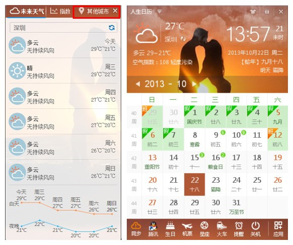 点击人生日历天气图标,会出现未来一周天气的窗口。点击右边“其他城市”就可以进入其他城市天气设置界面。