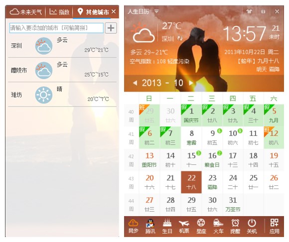 现在,人生日历又完善了一个天气功能,新增了其他城市的天气,出门在外的童鞋可以查看到家乡的天气情况;异地恋爱的童鞋也可以查看到心爱的他(她)的城市天气情况。关心更加直接。