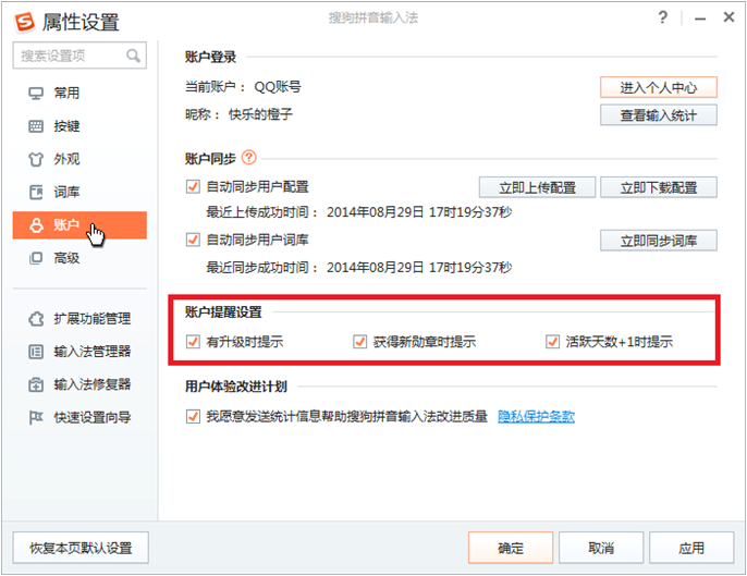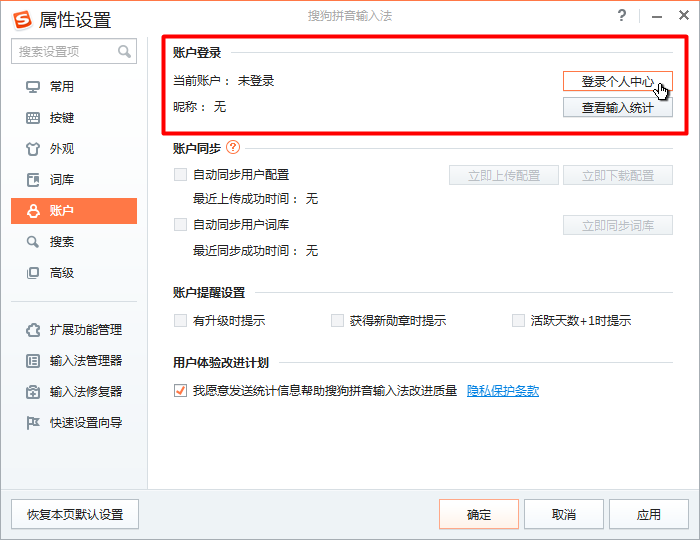 (3)输入法右键菜单→【设置属性】→【账户】→【账户登录】: