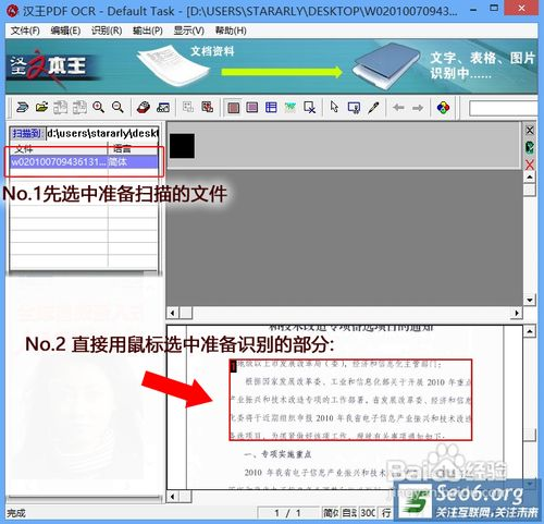 2、导入后,字左侧列表会显示图片,可以导入多张图片,选中后,右侧下半部分窗体会显示本章图片的内容。然后直接用鼠标拖拽,选中准备识别的部分: