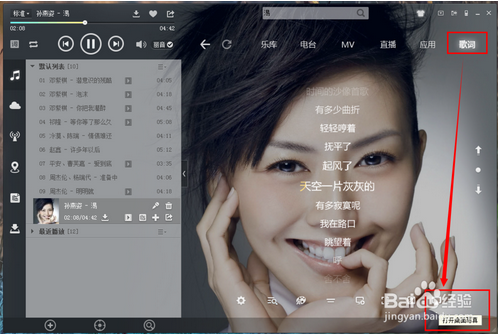 3、点击主菜单上的“歌词”,然后点击歌词下面“打开桌面写着”按钮。如图: