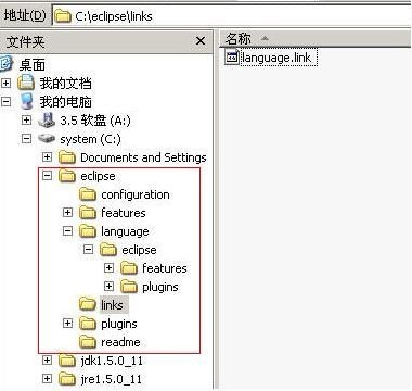 (3)建立语言包的link文件:在C:eclipse目录下新建一个目录并取名为links,在该目录中新建一个文本文件并取名为language.link(扩展名必须为.link),然后在language.link文件中加一行文字: