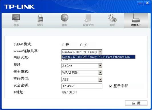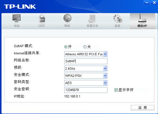 1. 开启SoftAP模式,设置“Internet连接共享”之外的其他参数,点击“应用”。