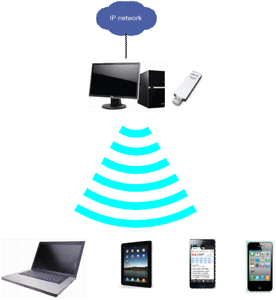在没有无线路由器的情况下,电脑通过有线连接到宽带线路已经可以上网。电脑上安装具有模拟AP功能的无线网卡,并设置共享可以访问互联网的网络连接,模拟AP与可以访问互联网的网络连接就虚拟出一个“无线路由器”。其他的无线设备如笔记本、手机、PAD等就可以无线连接上模拟AP共享上网了。