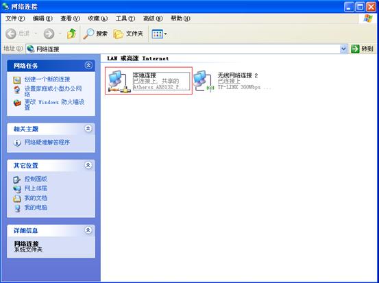 设置好上面的参数之后,点击“应用”。接着右键点击桌面“网上邻居”选择“属性”,打开“网络连接”,可以看到“本地连接”已经共享。