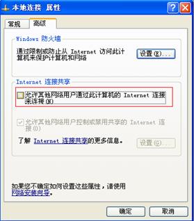 2. 取消本地连接的共享,右击“本地连接”,选择“属性”——“高级”,在“高级”选项中将 “Internet连接共享”——“允许其他网络用户通过此计算机的Internet连接来连接”勾去掉,然后点击“确定”。