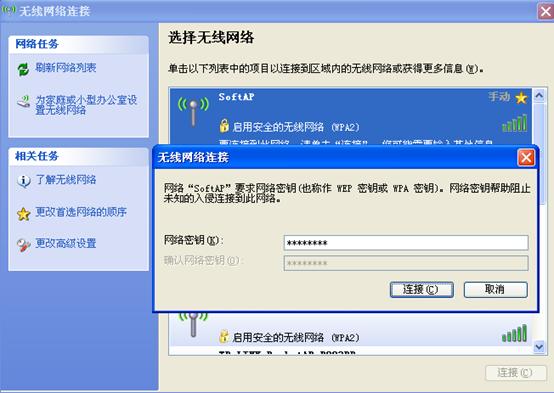 4. 无线连接SoftAP,电脑的无线连接搜索无线网络,选中“SoftAP”,并输入无线安全密钥。