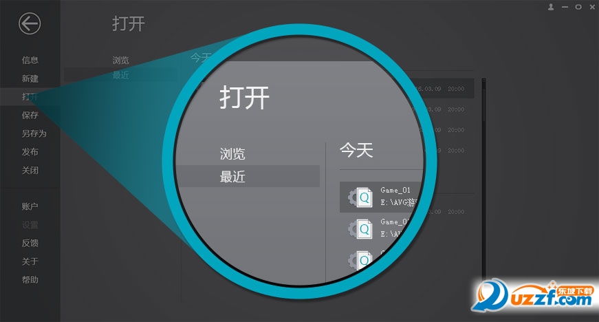 进入“文件”菜单上,单击“打开”(也可单击快速启动栏的“打开”),您将在右列中看到最近使用的游戏工程文档列表。如果您查找的游戏工程文档不在其中,请单击“浏览”,选择您之前保存过的游戏工程文件。
