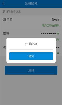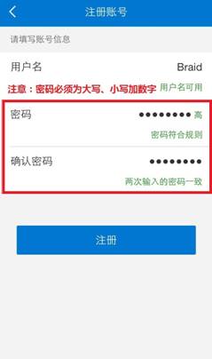 4、进入“注册账号”界面,填写用户名(注册后不可再修改,请记住用户名)、密码(密码须由大写、小写加数字组成),点击“注册”,提示“注册成功”,即注册完成,填写用户名、密码,点击“登陆”。