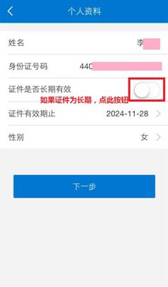 2、进入“个人资料”界面,填写“姓名、身份证号码、证件有效期止、性别”,点击“下一步”