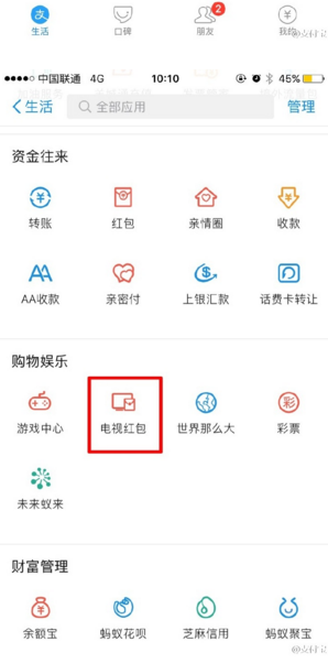 目前,电视红包功能已登录支付宝APP,打开支付宝APP——【全部】——【购物娱乐】——【电视红包】,点击中间圆圈识别广告,然后就可以愉快的抢红包了