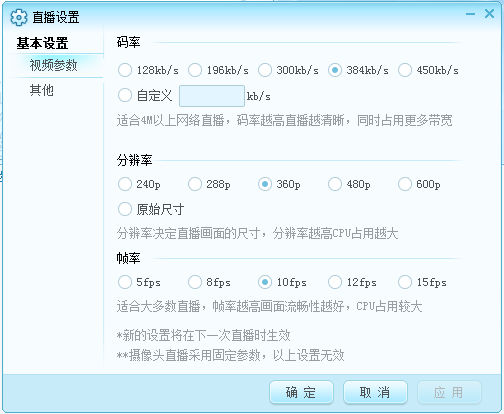 视频帧率游戏直播推荐使用10帧,最多12帧,如果CPU不够请使用8帧。
