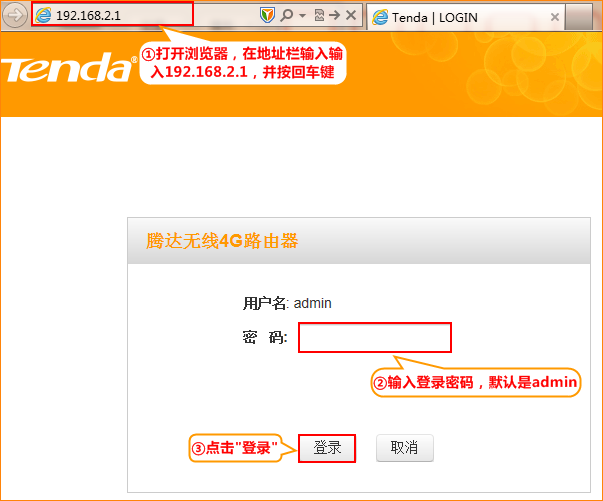 第一步:在浏览器中输入:192.168.2.1 按回车键: