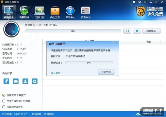 不少网友反映下载的瑞星杀毒软件V16+安装后,点击主界面的全盘查杀、快速查杀、自定义查杀时,会出现“瑞星扫描提示:瑞星病毒库版本过旧,建议更新完整病毒库后再继续杀毒。更新文件:升级失败稍后再试”的提示(如图1.jpg),或出现rsmain.exe应用程序错误