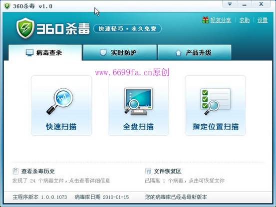 360杀毒提供了四种手动病毒扫描方式:快速扫描、全盘扫描、指定位置扫描及右键扫描。