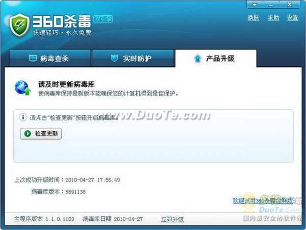 升级完成后会提示您:“恭喜您!现在,360杀毒已经可以查杀最新病毒啦!
