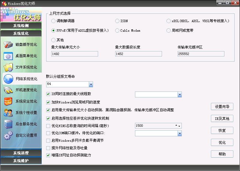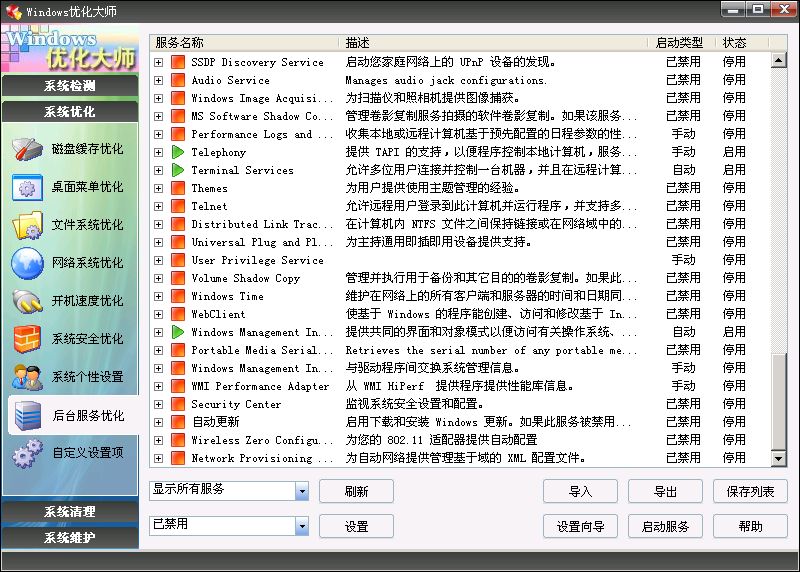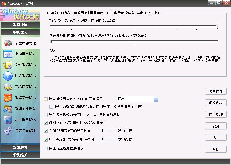Windows优化大师同时适用于Windows98/Me/2000/XP/2003操作系统平台,提供了全面有效、简便安全的:系统检测;系统清理;系统维护;系统优化 功能,让您的电脑始终保持在最佳状态。