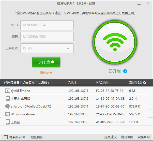2、打开后,通过“魔方WiFi助手”建立一个WiFi热点,其他设备便可以连接此热点免费上网,很方便实用。