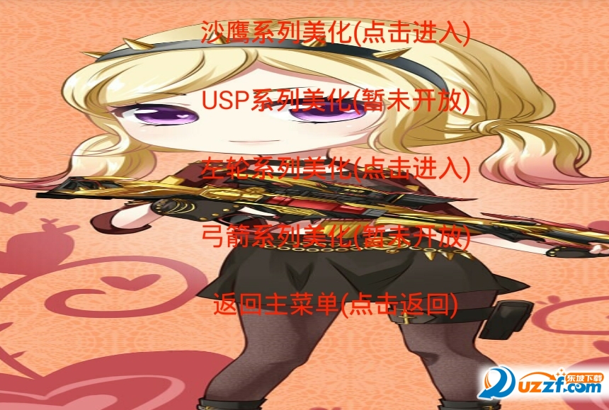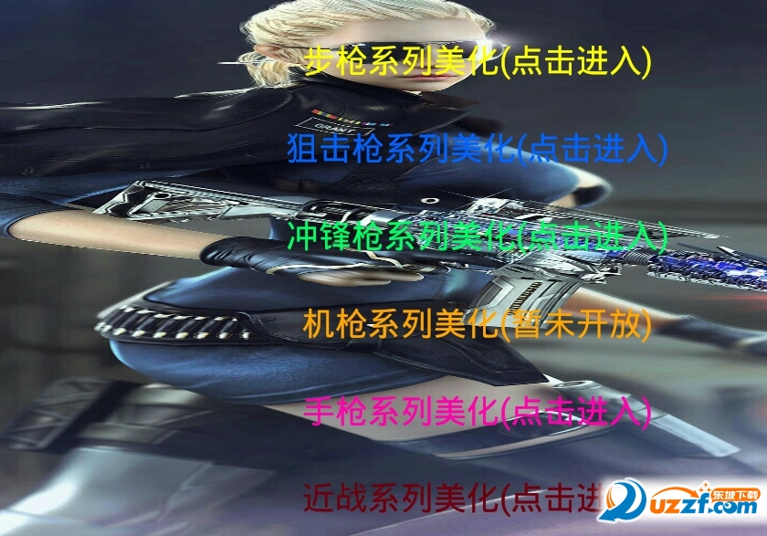 1、下载安装,如图所示,可以选择步枪系列美化、狙击枪系列美化、冲锋枪、近战、手枪系列美化等五个大功能模块