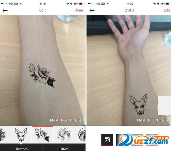 3、拍摄完成后,可更换纹身图案,或对图案做微小调整,如滤镜、亮度、透明度等。需要注意的是,生成的图片存在 InkHunter 的水印,目前还没办法去除。