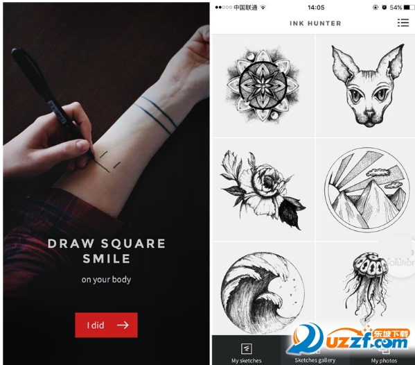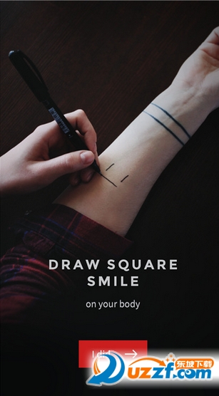 1、在使用 InkHunter 前,你需要做点准备工作,即用笔在身体上画一个呆萌呆萌的「方形笑脸」,接着,选择一个你有感觉的图案,就能看到逼真的纹身被「刻」在了身上。