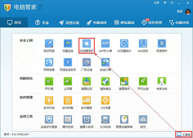第一步:打开电脑管家——点击工具箱——点击浏览器保护